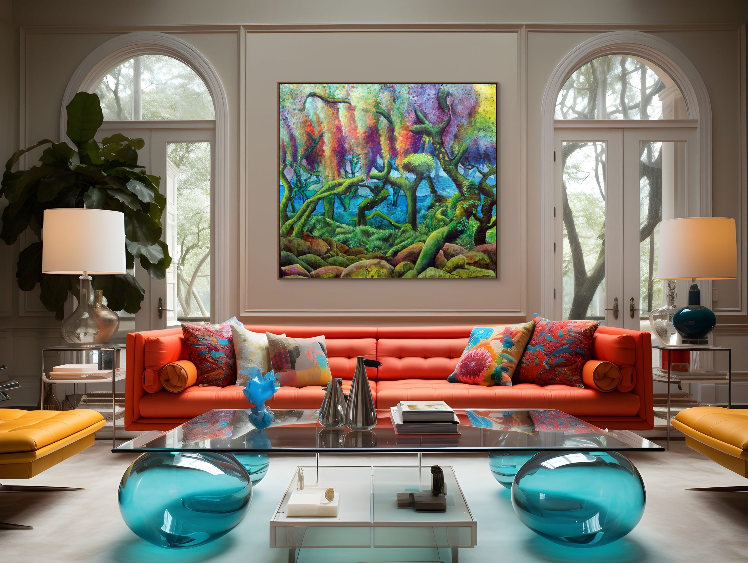 This piece is a celebration of the mysterious and magical qualities found where jungle wildness meets the delicate beauty of wisteria. Inspired by the lush moss-covered forests I adore, it evokes a cool, serene atmosphere filled with whispers of ancient secrets and quiet enchantment. Layers of vibrant greens, purples, and soft blues invite you into a hidden world where nature’s magic lingers just beneath the surface.